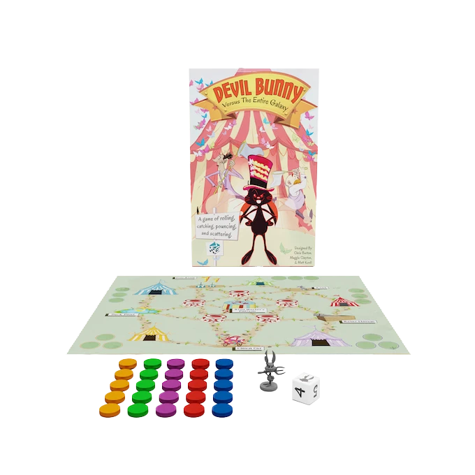 Each player chooses a color of butterflies to catch. Now you roll the dice. 1-5 and you’re in the clear. You can add more butterflies to the map, or guide the ones already there back to your circus tent. The color of the top token of each stack determines who guides the rest on the path back, and you can only move as far as there are tokens in the stack. But be careful! Roll a 6 and Devil Bunny hops on your stack and scatters your butterflies to the winds!