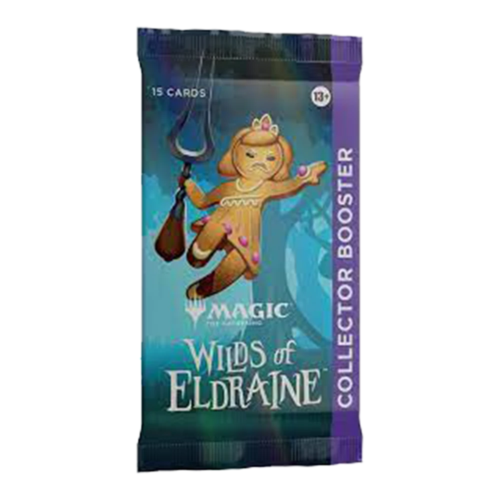 Each Wilds of Eldraine Collector Booster contains 15 Magic: The Gathering cards and 1 Traditional Foil double-sided token, with a combination of 5 cards of rarity Rare or higher, 5 Uncommon, 4 Common, and 1 Full-Art Land cards. Every pack contains a total of 10–12 Traditional Foil cards.