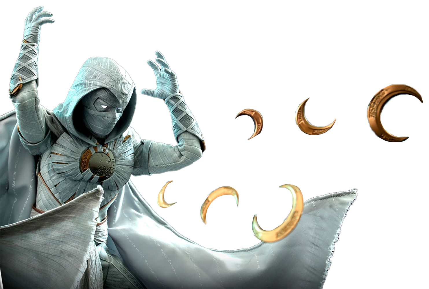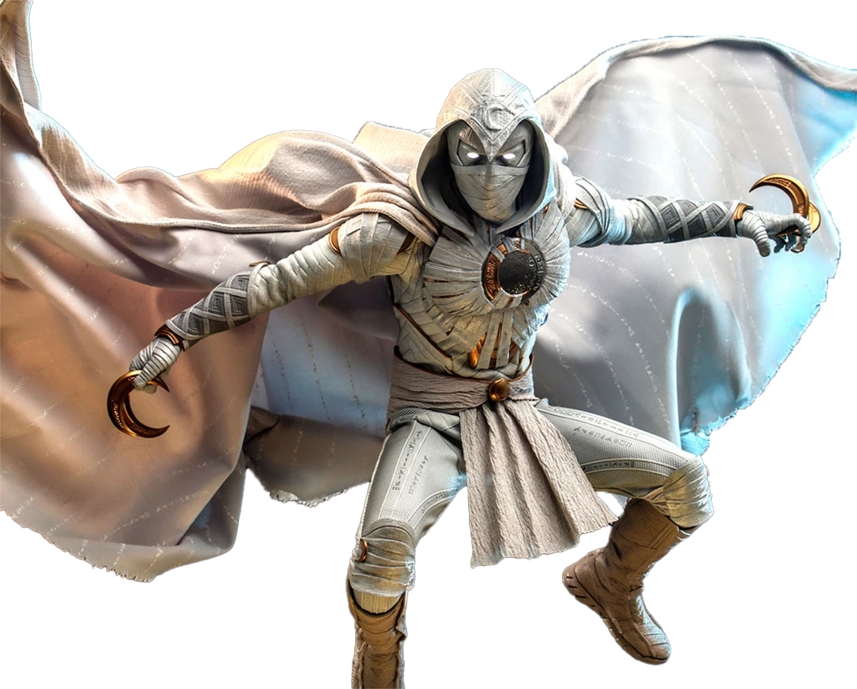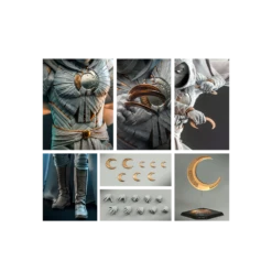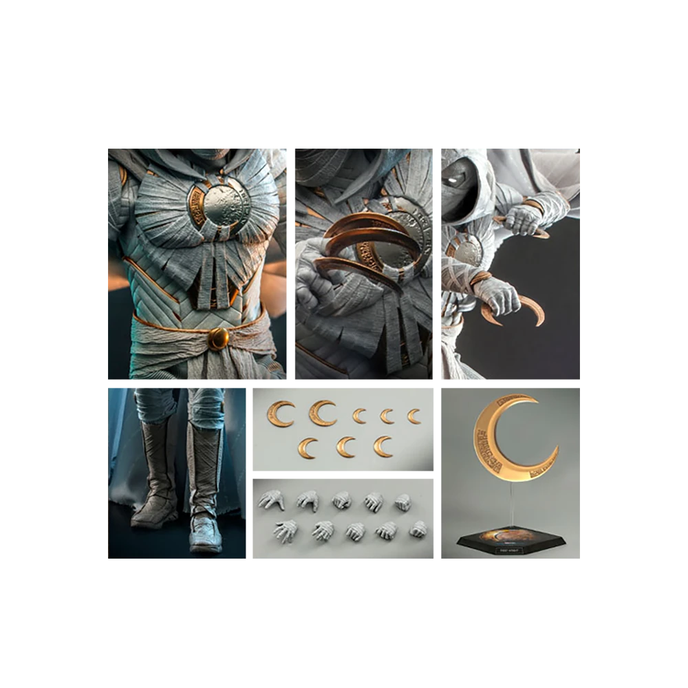 Inspired by his iconic appearance in Moon Knight series, the sixth scale Moon Knight figure features a newly developed head sculpt with LED light-up function; wrapping bandages are fully sculpted to capture his mystic appearance; a finely tailored Moon Knight costume consisting of armour parts also cape covered with ancient symbols and patterns, fabric belt in addition to the sculpted boots; his signature crescent blades comes in a variety of sizes, a crescent moon backdrop, and a figure stand.