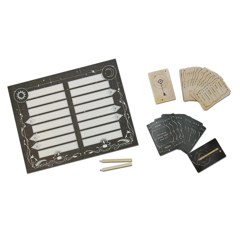 The spirit discards one question card face up, then returns the question card it’s going to answer to their mediums, then slowly writes the answer one letter at a time for all to see. As soon as the mediums think they know what this clue word is, they yell “Silencio”, and the spirit stops writing. The other team of mediums might see only the letter “Y”, but if you know the question is “What color is it?”, then you know the clue must be “yellow”. To end your turn, draw two new question cards.