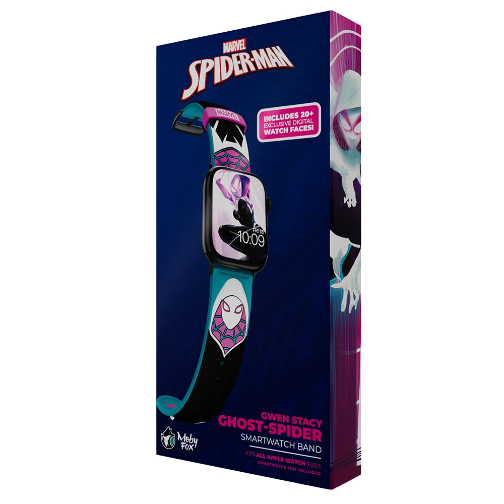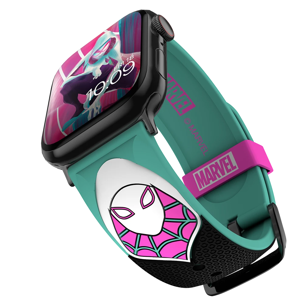 What’s up, danger? Join the ranks of your friendly neighborhood Spideys with a textured smartwatch band inspired by Gwen Stacy’s Spider-Woman outfit. This stylish strap is made of sculpted silicone and features a vivid “ghost-spider” color scheme as well as the iconic Spider-Gwen hood and mask.