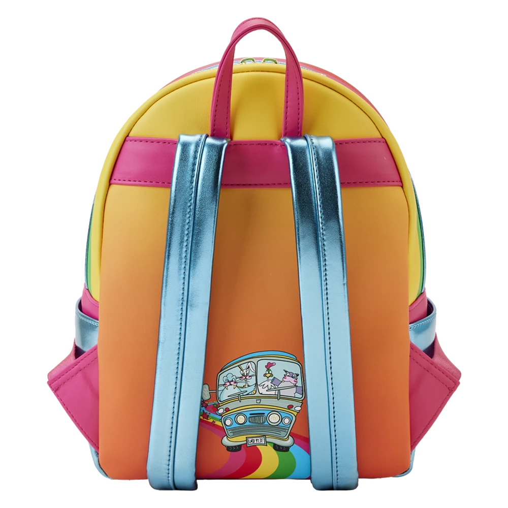 The Loungefly The Beatles Magical Mystery Tour Bus Mini Backpack is made of vegan leather (polyurethane). Bag has adjustable shoulder straps and shiny gold hardware.